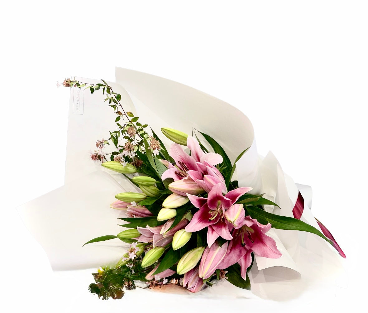 Each bouquet is carefully arranged with fresh, long-stemmed Oriental lilies, known for their large, star-shaped blooms and rich hues. Their sweet, lingering fragrance adds a touch of luxury to any setting.